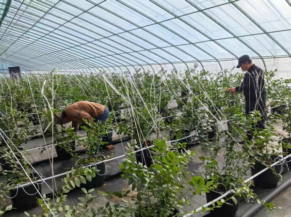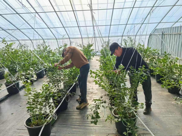 该蓝莓产业园是当地推动乡村振兴的重点项目,占地8700平方米,总投资400余万元,建有5座智能化种植大棚,引进了3500盆优质蓝莓苗。“蓝莓对生长环境要求极高,如今能稳定开花,多亏了这套智能化系统保驾护航。”前江村党支部书记吴胜军介绍。大棚全面配备了水源热泵和自动通风系统,能精准调控棚内温湿度,配合回液槽和导水装置,实现了水分的循环利用与精准灌溉。