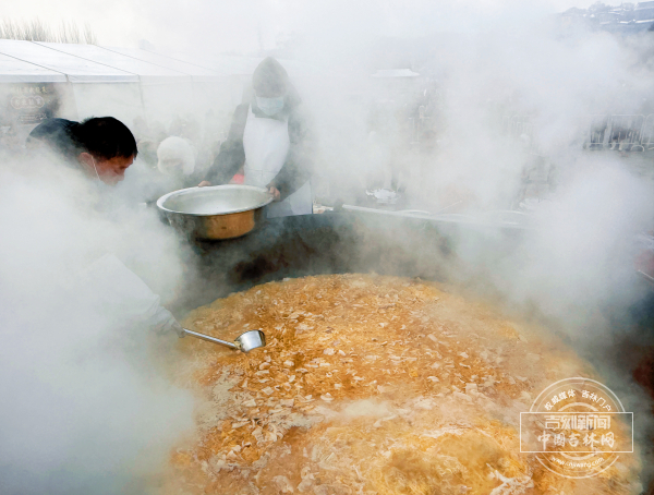 记者在现场看到,空地正中高高架起一口直径2米的大锅,鲜香地道的年猪烩菜正在锅里翻滚,升腾起滚滚热气。锅旁的几位专业厨师不时添汤、搅拌、查看火候,确保香喷喷的年猪烩菜按时出锅。