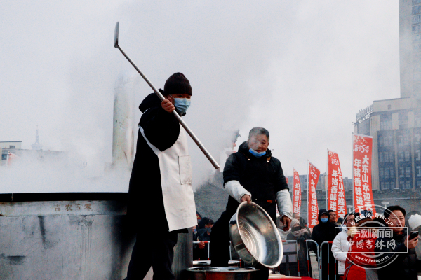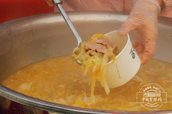 “这一锅食材大约有1吨,里面放了200多斤黑猪肉。”来自吉林市老字号新兴园的杨师傅一边翻动大勺,一边对记者说:“我们从早上8点开始煮,足足炖了3个多小时,让大家一会都能吃到地道的、热乎乎的吉林年猪烩菜!”