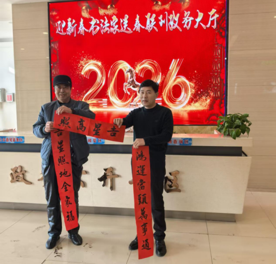 现场墨香四溢,书法家们挥毫泼墨、笔走龙蛇,一句句寓意美好的祝福跃然纸上。群众围拢在案前,或静静观赏,或轻声交流,纷纷挑选心仪的联句,期待这份手写的年味。红纸黑字,不仅晕染出浓浓的传统年俗气息,也承载着对新春的美好向往,让政务大厅洋溢著温馨与暖意。