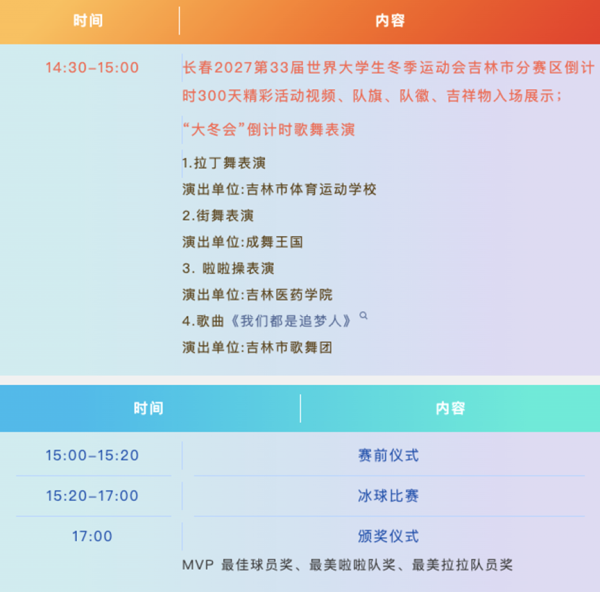 3月21日,长春2027第33届世界大学生冬季运动会吉林市分赛区倒计时300天精彩活动将在吉林市体育馆举行,2026吉林市“雾凇杯”冰球超级联赛也将迎来第三场蛟河市对龙潭区的比赛。