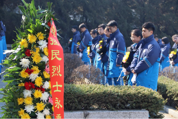 随后,与会代表前往墓区祭扫。在烈士墓前,所有人默哀以寄哀思。吉林市实验中学学生代表献词《缅怀英烈魏拯民 赓续红色爱国魂》,表达对魏拯民烈士的敬仰与赓续红色血脉的决心。参与人员有序擦拭墓碑、清理落叶,向魏拯民烈士像和烈士墓碑敬献花篮和花束。